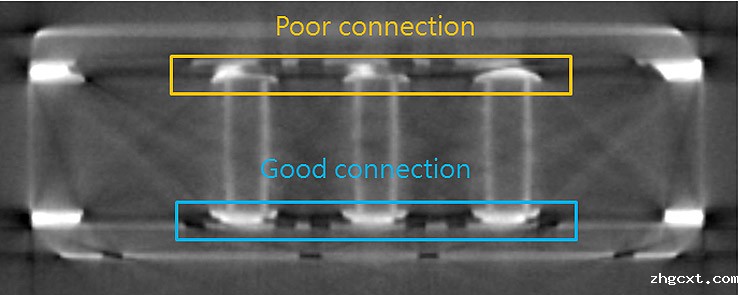 我们了解到这是包装不良的结果。由于封装后的尺寸较大,因此可以通过“无损技术分析”轻松识别缺陷。建议通过3D-X射线CT检查来发现这种“关节连接不良”。