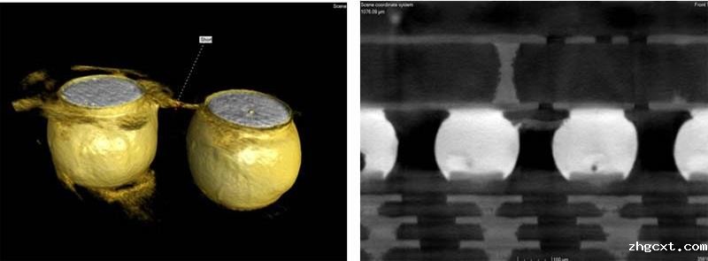 通过故障点处热辐射的相位差检测 3D 封装的故障深度(Z 轴方向),而不会损坏受电的 3D 设备,从而快速定位故障点(获取其 XYZ 坐标),进而得出缺陷落在焊球处的结论(见下图)。