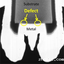 (2) 双光束FIB切片(图2-2)立即揭示介电氧化物层的缺陷!烧坏的绝缘层导致顶部和底部电极金属泄漏。